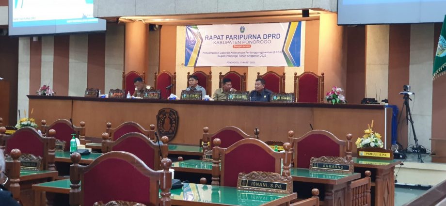Ponorogo, Rednews.co.id – DPRD Kabupaten Ponorogo menggelar rapat paripurna dengan agenda mendengarkan pidato pertanggungjawaban Kang Giri selama memerintah kabupaten Ponorogo tahun 2022. Dalam sidang ini Bupati menyampaikan Laporan Keterangan dan Pertanggungjawaban Bupati Ponorogo tahun 2022. Berisi kemajuan Ponorogo tahun 2022.