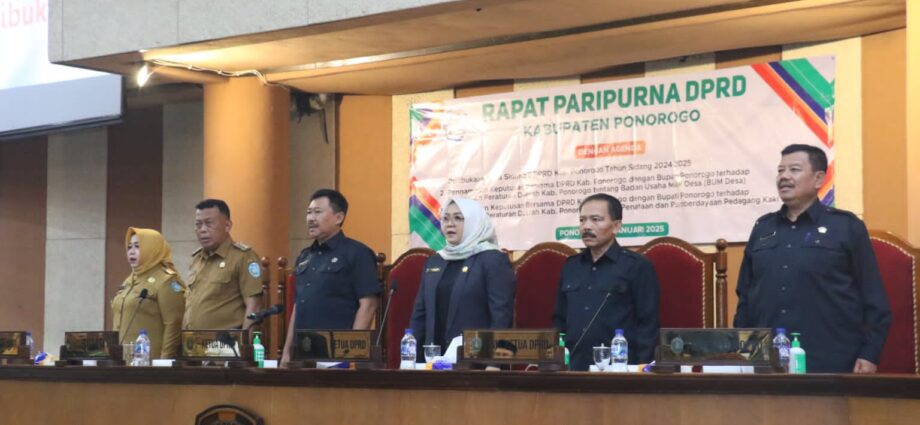 Ponorogo rednews.co.id ,Bupati Sugiri Sancoko dan Ketua DPRD Ponorogo Dwi Agus Prayitno mengambil keputusan bersama dengan menandatangani dua Raperda dalam sidang paripurna DPRD Kabupaten Ponorogo, Senin (13/1/2025). Raperda pertama tentang tentang BUMD. Kedua, tentang penataan dan pemberdayaan pedagang kali lima.