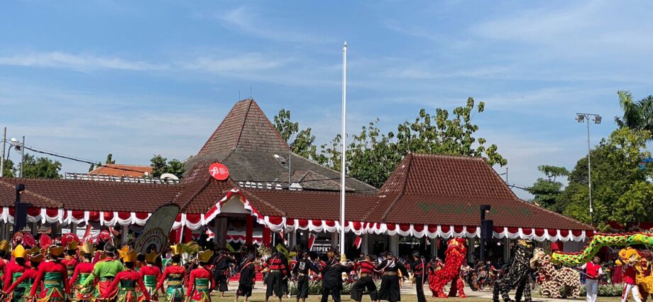 Bojonegoro,rednews.co.id – Penampilan kolaborasi berbagai unsur budaya Bojonegoro menjadi suguhan spektakuler bagi tamu undangan dan warga sekitar pada pra acara upacara HUT Ke-78 Kemerdekaan Republik Indonesia yang digelar oleh Pemerintah Kabupaten Bojonegoro. Upacara dipimpin langsung Bupati Bojonegoro Anna Mu’awanah di alun-alun Kabupaten Bojonegoro, Kamis (17/8/2023).