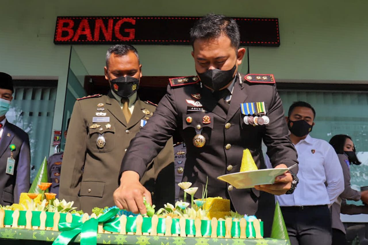 Kapolres bersama pejabat utama juga memberikan kejutan dengan membawa kue ulang tahun beserta tumpeng kepada komandan Kodim 0814 Jombang Letkol Inf Triyono di Markas komandonya Jalan Wahid Hasyim.