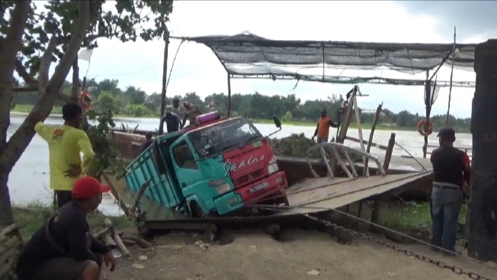“Tadi sepertinya penopang jembatannya tidak kuat menahan, sehingga ambles. Truk dari arah Nganjuk mau ke Jombang, membawa muatan bawang merah,” kata Sujono.