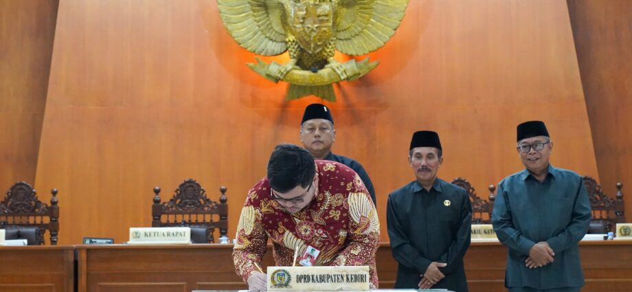 Persetujuan kalangan legislatif itu dibuktikan dengan penandatangan nota persetujuan bersama terhadap tiga Raperda antara pimpinan DPRD Kabupaten Kediri dengan Bupati Hanindhito Himawan Pramana (adv/diskominfokdr).